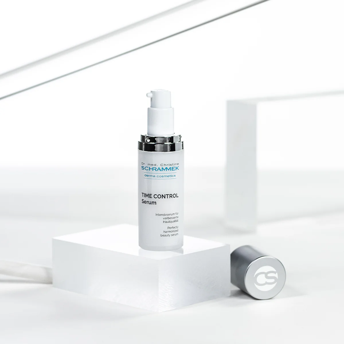 A Dr Schrammek TIME CONTROL Serum egy rendkívül koncentrált, könnyed állagú anti-aging szérum, amely a bőr fiatalos működésének újraindítására fókuszál. Ez a „fiatalság-aktiváló” elixír az érett és igényes bőr komplex ápolására született: mélyebb rétegekben fejti ki hatását, mint egy arckrém, így intenzívebben küzd a feszességvesztés, a rugalmatlanság és a ráncok kialakulása ellen. Gyorsan felszívódó formulája azonnal élettel tölti meg a fáradt arcbőrt, selymes tapintást és láthatóan megemelt kontúrokat eredményezve.