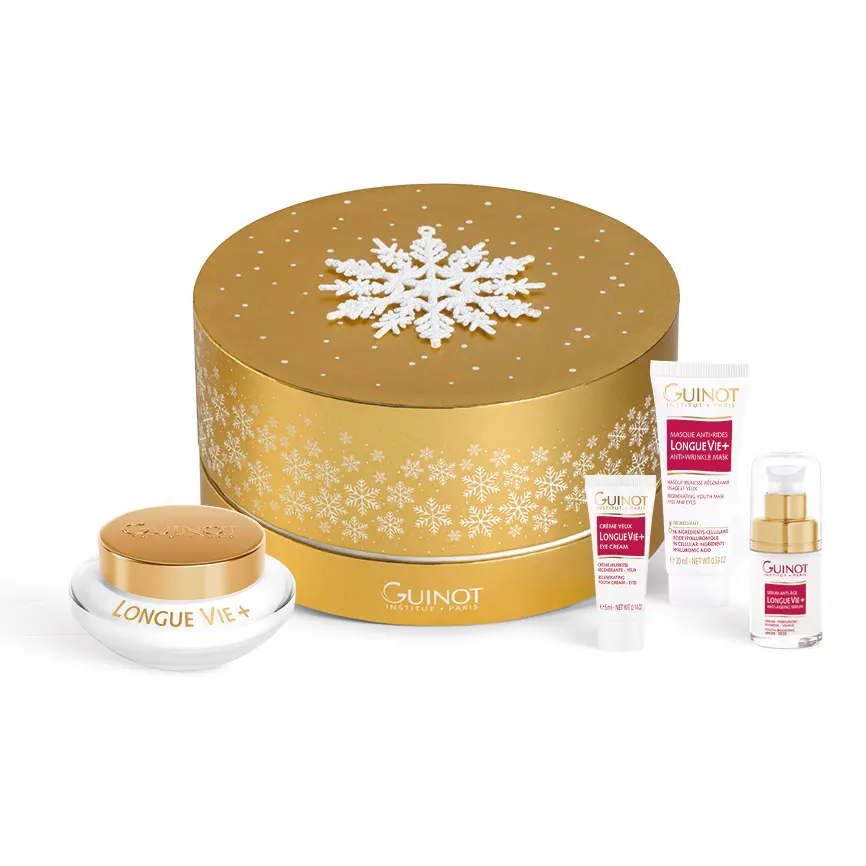 A Guinot Longue Vie+ Anti‑Aging Gift Set egy átfogó, luxus anti-aging ajándékcsomag, amely a sejtregeneráció élvonalbeli összetevőit ötvözi a Guinot öregedésgátló Longue Vie+ vonalával. A négy termék együttesen célzottan küzd az öregedés jelei – ráncok, rugalmasságvesztés és fakó bőrfelszín – ellen. A karácsonyi kiadás különösen kedvező vétel, hiszen a csomagban lévő prémium termékek együttes ára jelentősen alacsonyabb, mintha külön-külön vásárolnánk meg őket. Ezáltal kiváló és elegáns ajándék lehet önmagadnak vagy szeretteidnek.