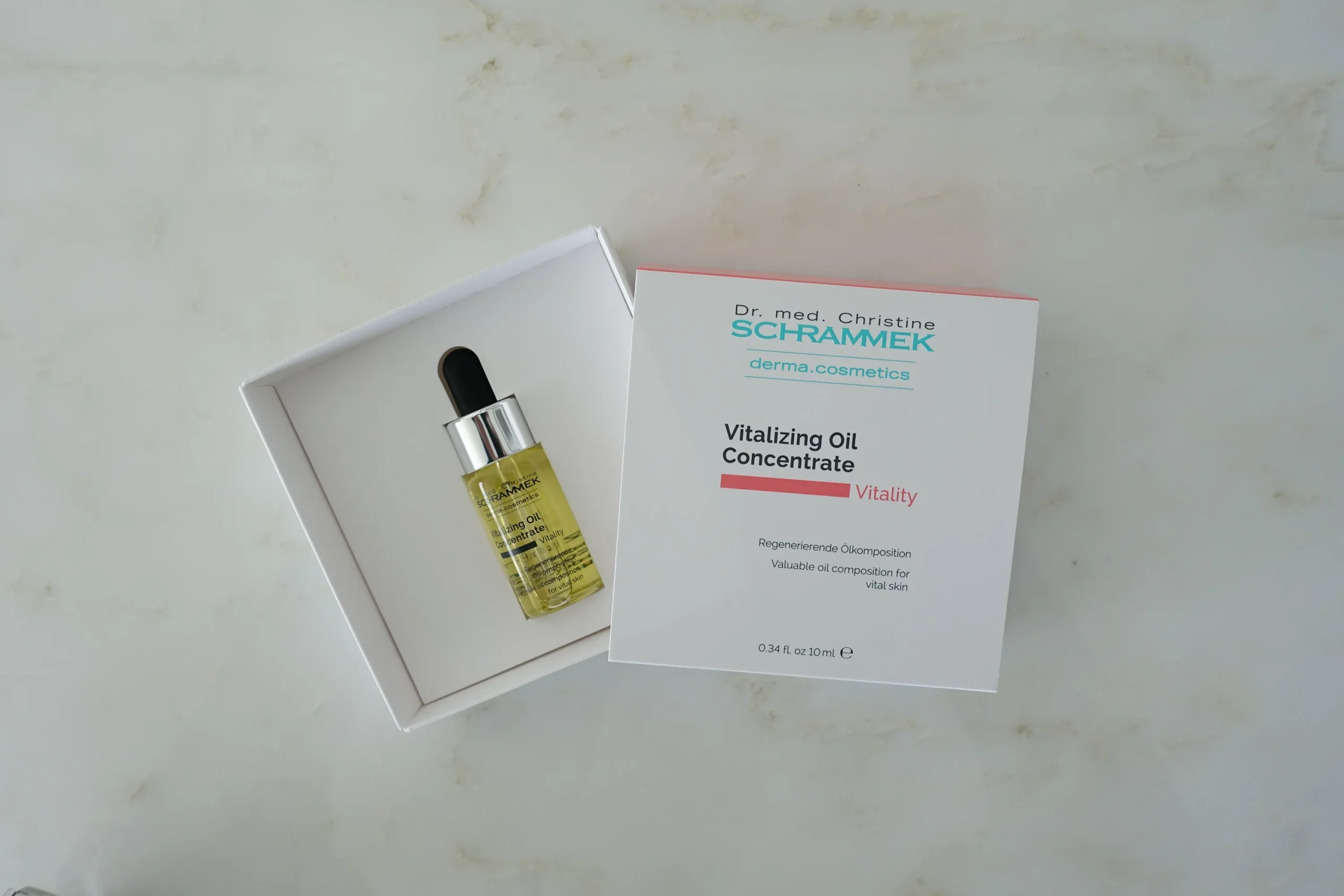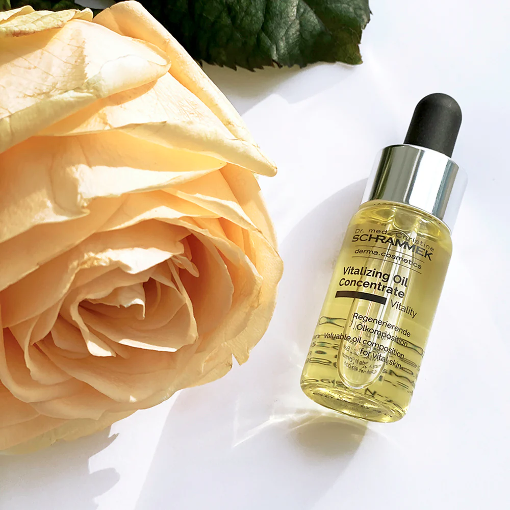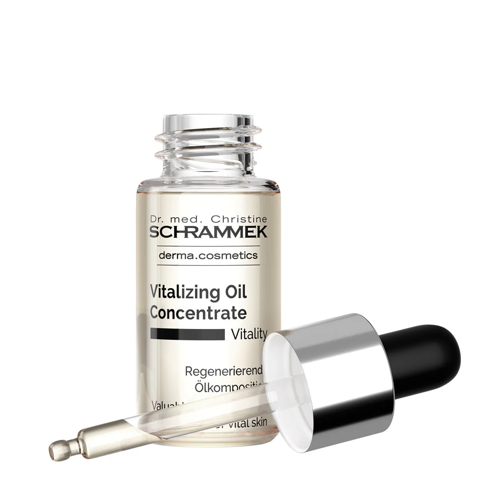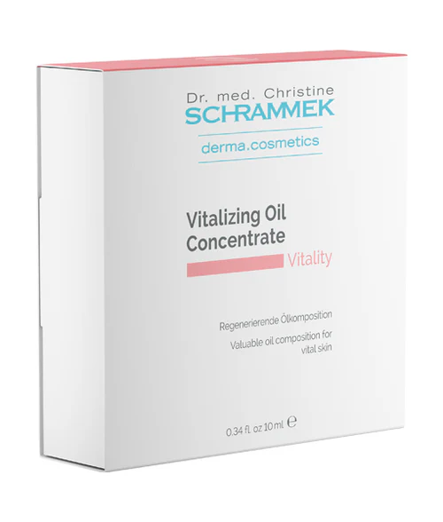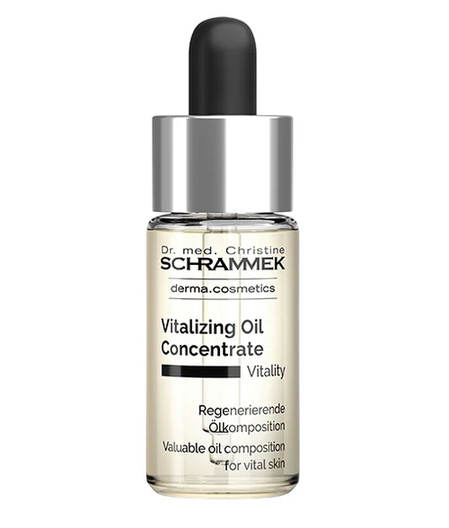 A Dr Schrammek Vitalizing Oil Concentrate egy rendkívül gazdag, értékes növényi olajokból összeállított energetizáló koncentrátum. Ezt a speciális olaj-szérumot a fáradt, fakó, száraz és rugalmasságát vesztett bőr azonnali vitalizálására fejlesztették ki. Könnyű szerkezete ellenére mélyen táplálja a szöveteket, segít helyreállítani a bőr természetes lipidrétegét, és látványos ragyogást kölcsönöz az arcbőrnek. Ideális választás, ha a bőrnek extra védelemre és energiára van szüksége a környezeti stresszhatásokkal szemben.