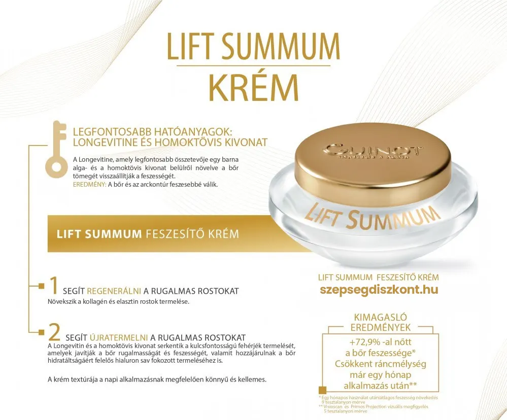 A Guinot Creme Lift Summum belülről építkezve állítja vissza a megereszkedett, száraz, vízhiányos bőr feszességét a Guinot Creme Lift Summum, amely csökkenti a látható ráncok mélységét. Hatóanyagai az elasztin és kollagénszintézis fokozásával újraépítik a kötőszöveti rostokat, a proteintermelés serkentésével újraformálják a bőr szerkezetét, valamint a hyaluronsav-szintézis elősegítésével erősítik a kötőszövetet. Az életkor előrehaladtával csökkennek az olyan támasztó rostok, mint az elasztin és a kollagén (amelyek a bőr sűrűségét és feszességét adják), amitől a bőr vékonyabb lesz, veszít volumenéből és ráncok alakulnak ki. Az arcplasztika örvendetes alternatívájaként ez az új krém a Guinot kulcsfontosságú összetevőit, a longevitint és a homoktövist használja, hogy segítsen helyreállítani a bőr sűrűségét és minimalizálja a ráncok megjelenését a feszes és sima arcszín érdekében.