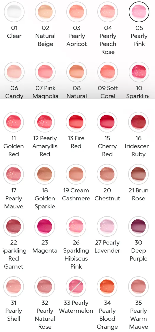 - Széles színválaszték: A termék 30 különböző árnyalatban érhető el, beleértve átlátszó, nude, rózsaszín, piros, korall és lila tónusokat, különböző fényességi hatásokkal. Átlátszótól naturálig, meleg-hideg tónusokig