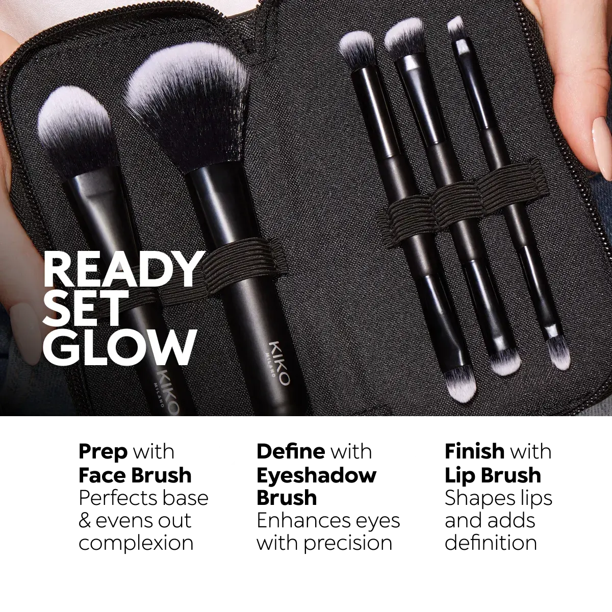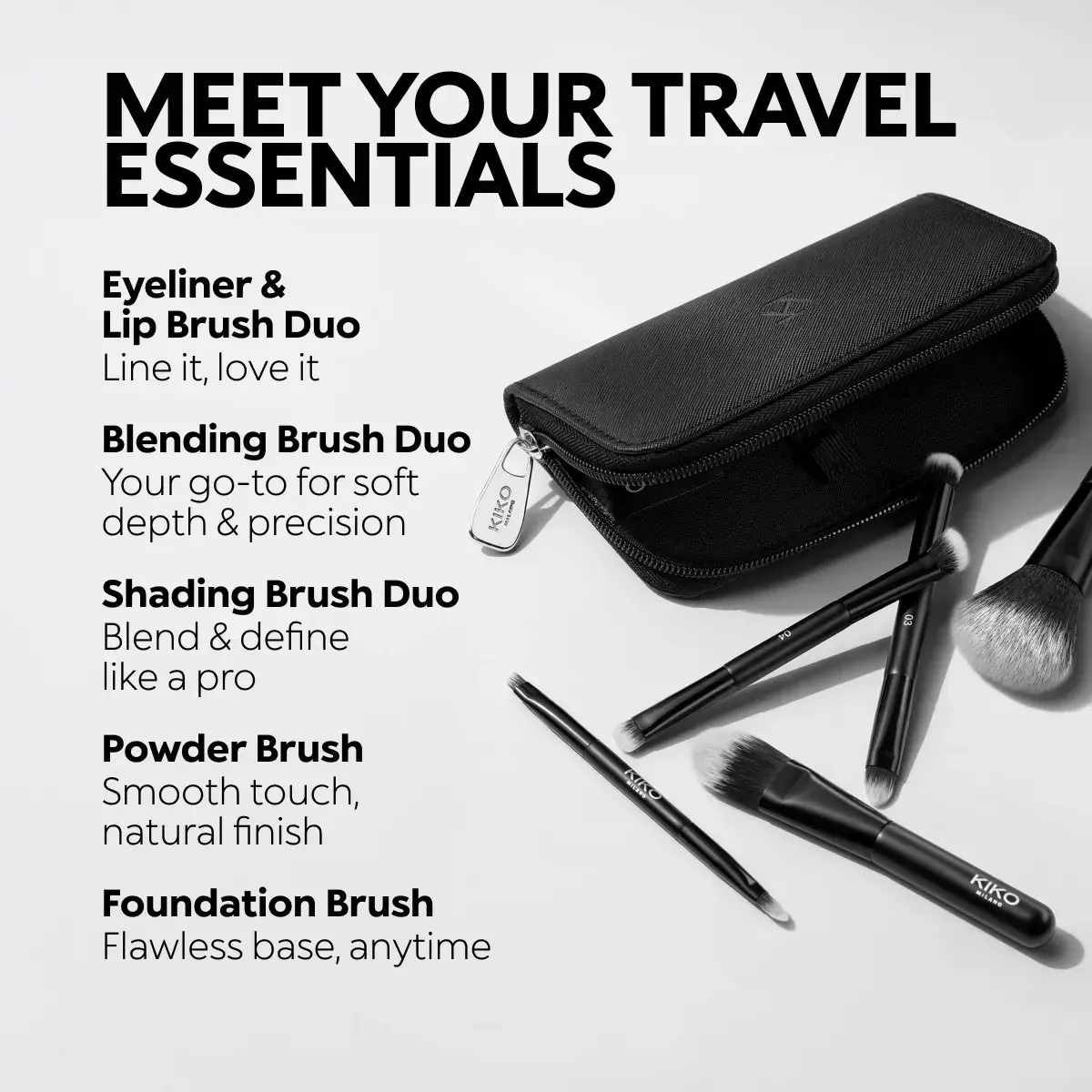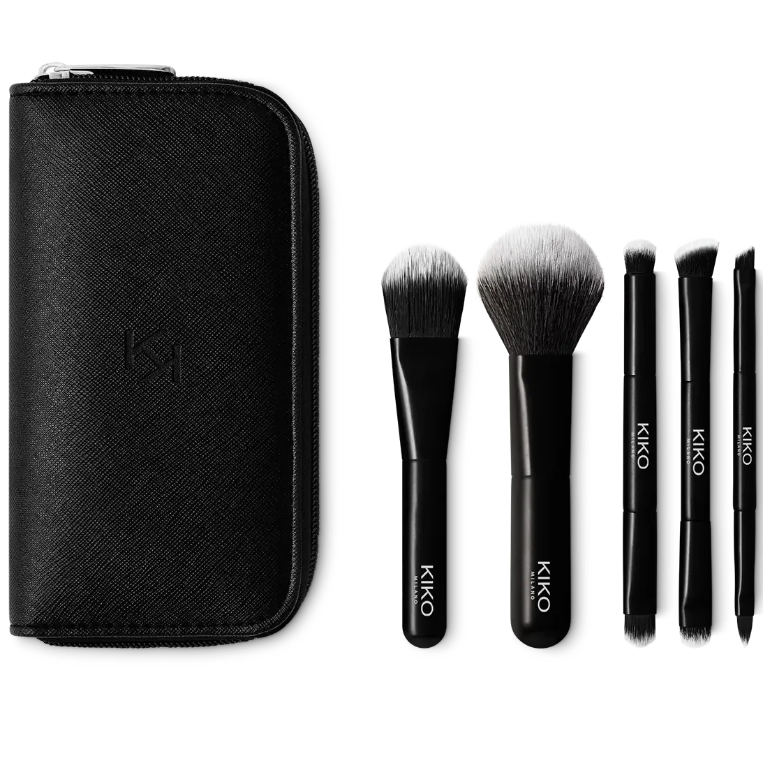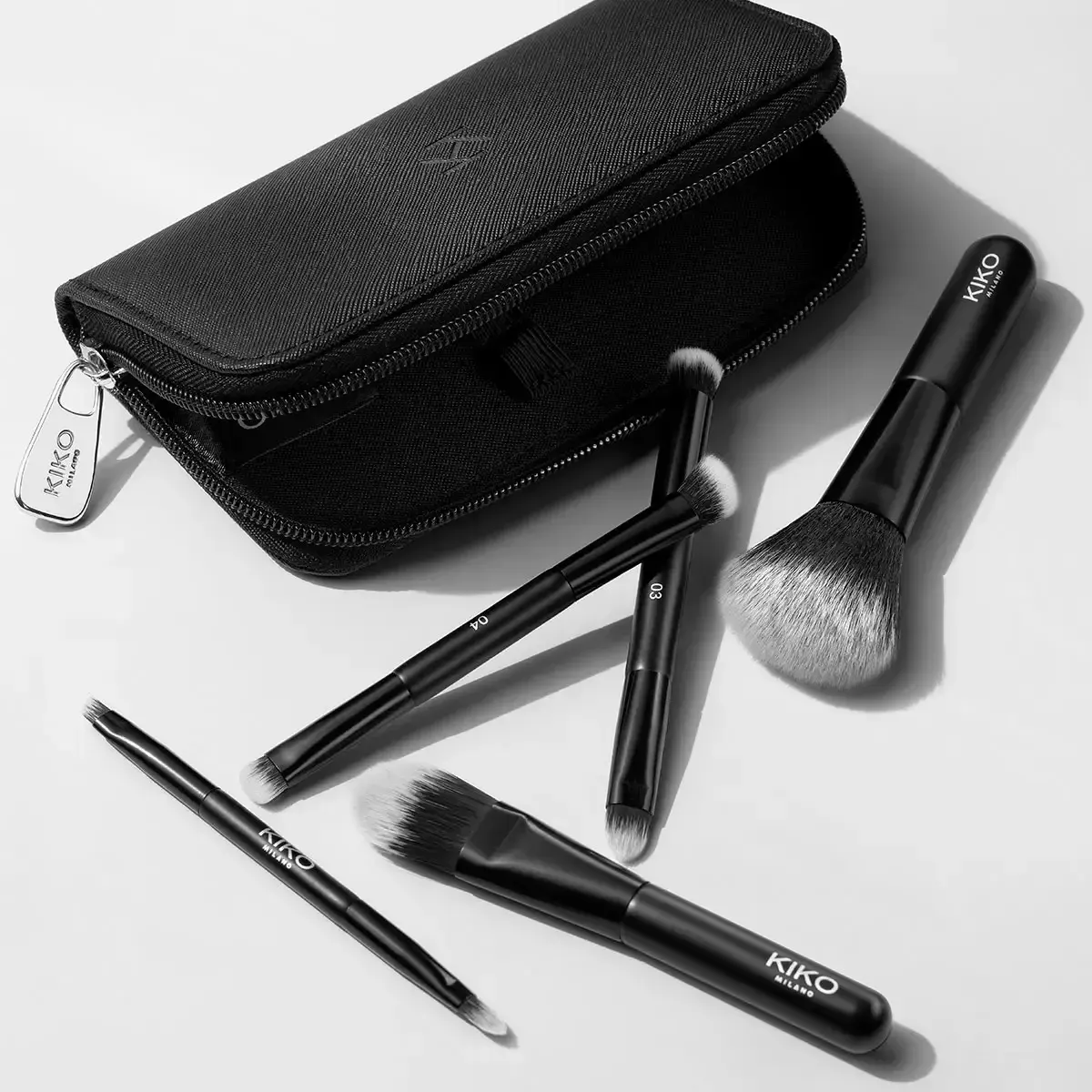 A KIKO Milano Travel Brush Set egy kompakt sminkecset-szett, ami 5 különböző ecsetet tartalmaz — így arcbőr, szem és ajkak sminkeléséhez is elegendő eszközt ad. A szetthez tartozó elegáns, strapabíró tárolótáska lehetővé teszi, hogy az ecsetek mindig rendezettek legyenek, és bárhová magaddal vidd őket. Az összeállítás célja, hogy akár úton, akár otthon, gyorsan és profi eredménnyel elkészíthesd a sminkedet.