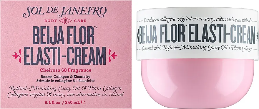 A Sol de Janeiro Beija Flor Elasti-Cream egy gazdag, bőrelasztikusságot fokozó hidratáló testápoló krém, amelyet a Sol de Janeiro márka brazil ihletésű ápolási filozófiájával fejlesztettek ki. Elsősorban a bőr rugalmasságának és hidratáltságának javítására szolgál, miközben lágy, bársonyos érzetet ad a bőrnek.